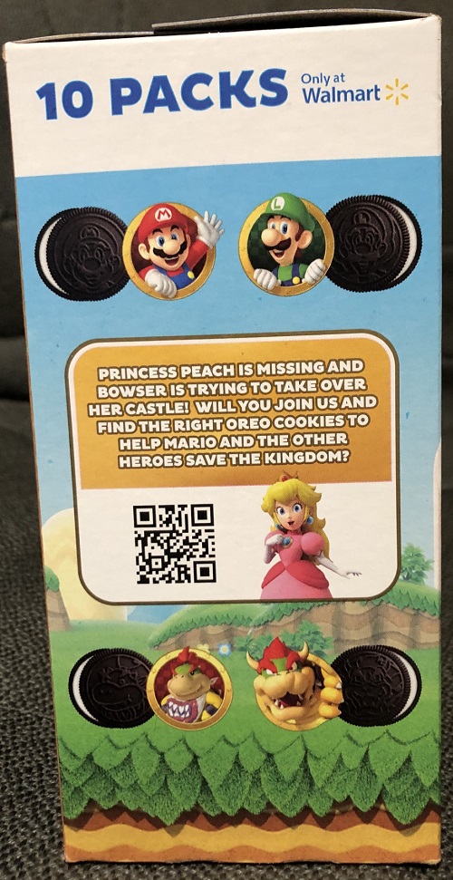 On the side of the box is a QR code you can scan that’ll take you to a Mario Oreo website. There you can buy the Oreos online, watch videos and commercials, and they tell you about a special ‘game’ where you can defeat Bowser! And they tell you what characters are on the Oreos.