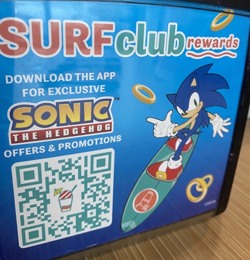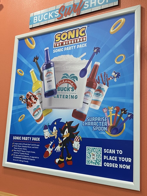 Sonic the Hedgehog is really getting around at eating establishments this year! First it was IHOP, now Bahama Buck’s, a snow cone place. A while back, my mom and stepdad came out to visit, and when they left, they stopped by Bahama Buck’s on the way out. I didn’t go with them because I don’t like snow cones. Too syrupy sweet for me. Anyway, it’s too bad I didn’t go because they had a Sonic promotion at the time. Luckily they took pictures for me and got everything they could, so here’s some pictures and info and things. I’m not sure if the promotion is still going on as of this writing (probably not), as it’s hard to keep up with these things.