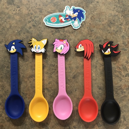 And last are the spoons. You could buy a blind box style wrapped package with a Sonic character spoon inside. Luckily they were able to get all of them for me, plus a sticker. The character heads can be removed from the spoons, and they kind of remind me of those things you put on croc shoes. Not sure if they really are since I don’t wear crocs, but here are the spoons and sticker.