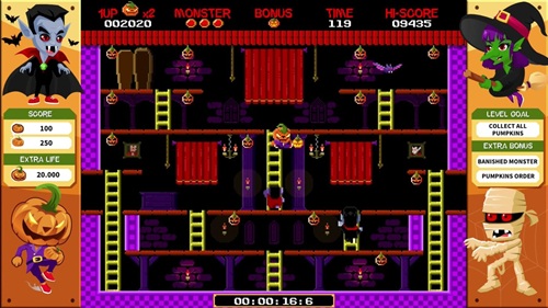 When you start you can first choose to play an easy mode or harder modes if you’ve unlocked them. The easy mode has you do one round of each stage before it ends, and harder modes let you loop a few times. The object in each stage is to collect all the pumpkins. When you do, you can choose the next stage. But you must climb ladders and jump to avoid monsters and creepy critters. If you get hit, you’ll lose a life. Lose all lives and it’s Game Over.
