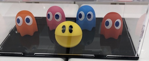 So now the tokens you collect can be used at new gashapon machines in the arcade.  These are modelled after real life gashapon machines that Bandai makes, so way to go with using the merger, Namco!  You can buy figures of characters and items (kind of like how you do in Kirby and the Forgotten Land), and decorate Pac-Village with them!  I actually visited a store in Grapevine Mills Mall in Texas that has nothing but those gashapon machines, so I thought I’d go off topic for a bit and share some pictures of them here.