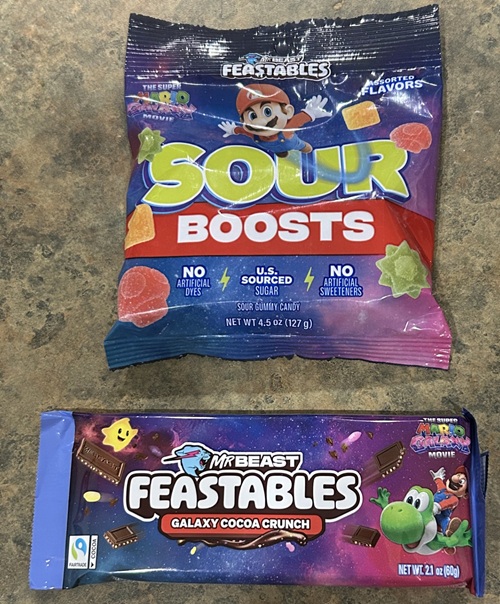 Actually one last thing. A close relative of mine bought me these Mario Galaxy candies. Yeah they’re not cereal, but as sugary as these are, they might as well be. It says they’re made by “Mr. Beast.” I’ve never heard of that candy company before, but then, I don’t really eat a lot of candy so I’m not in the know. First are these Sour Boosts. They’re like a cross between a gumdrop and those Sour Patch Kids. Some are even shaped like the Star Bits in Mario Galaxy, which I hear was also based on a Japanese candy. Next is a “Feastables” candy bar. It’s just a basic candy bar with nuts. It kind of reminds me of those band fundraiser candy bars, only much better.