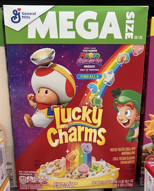 Aw man, my favorite Mario character: Toad, is on my least favorite cereal: Lucky Charms. I’ve never liked cereals with marshmallows in them. It killed me when I was a kid and found out the Pac-Man cereal had marshmallows in it. When I was a kid and if I spent the night at a friend’s house and they had Lucky Charms for breakfast the next day, I’d put all my marshmallows in my friend’s bowl and his mom would wonder why he was hyper all day!